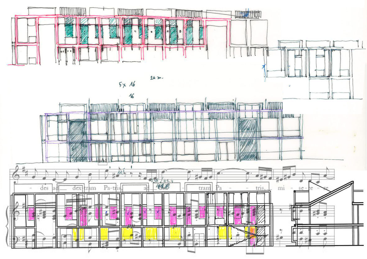 La façade dessinée sur cette cour propose donc une trame régulière, un rythme régulier et simple de la structure bois, comme une portée musicale. A partir de ces lignes de portée, la façade se développe en autant de modulations et de variations de thèmes réguliers qui se chevauchent et jouent avec les lignes. Entre les éléments pleins, les vides laissent voir l'intérieur, les circulations. Dès lors la perception de la transparence du bâtiment donne une profondeur et une complexité de lecture accrue. L'esquisse présentée est le début d'une recherche sur les rythmes entre trame de base, modulation des panneaux de façade et « fond sonore ». |