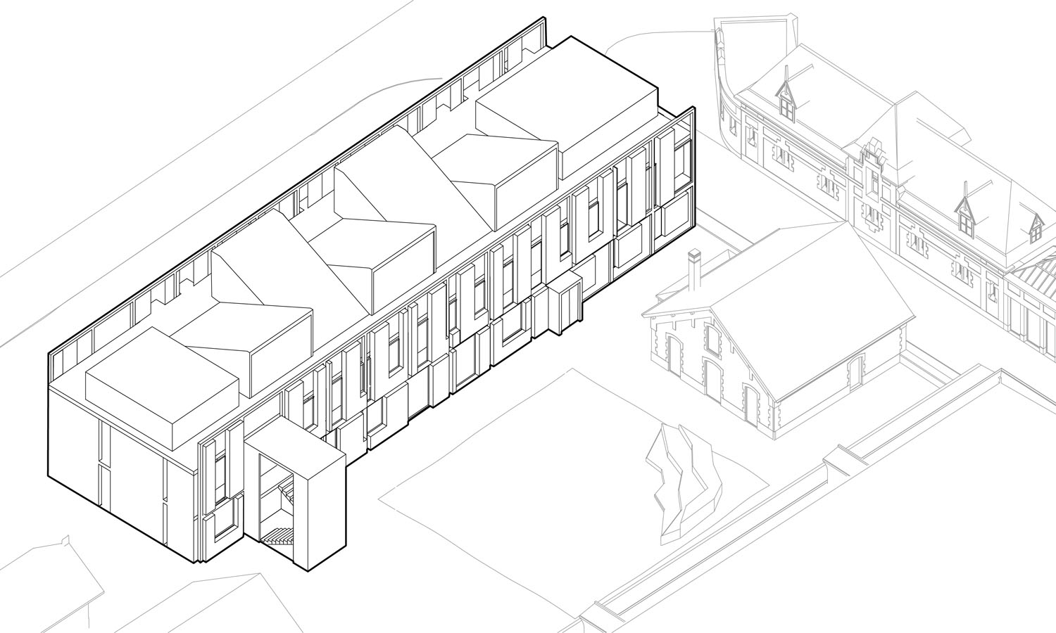 Il est proposé également une succession de volumes émergents en toiture prenant la lumière à l'ouest ou à l'est et offrant des volumes intérieurs aux ambiances changeantes provoquées par ces orientations différentes. Cette couverture sert également aux capteurs énergétiques qui seront imposés dans la nouvelle réglementation thermique (BEPOS – RT2020). |