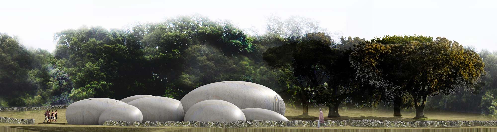 Ce matériau unique et brut, qui affleure le sol, émerge, dessine des contours savants, est séduisant. C'est le matériau brut par excellence et en même temps très sophistiqué dans sa forme, son agencement dans le paysage. L'idée d'une architecture inspirée de ces rochers s'impose immédiatement tant cette matière est simple, ce « matériau » lisse est beau. Cette architecture devient un pont qui relie les époques entre le brut, le commencement et notre époque qui vient à sa rencontre. |