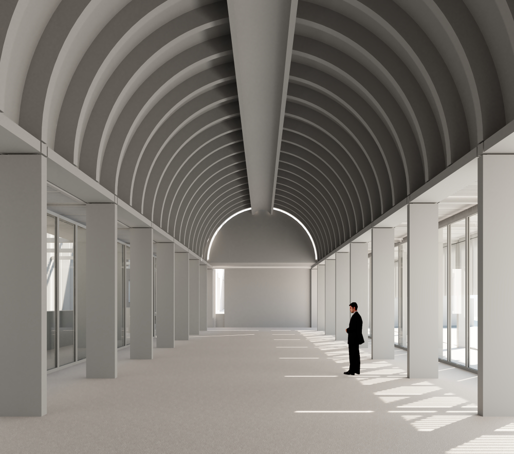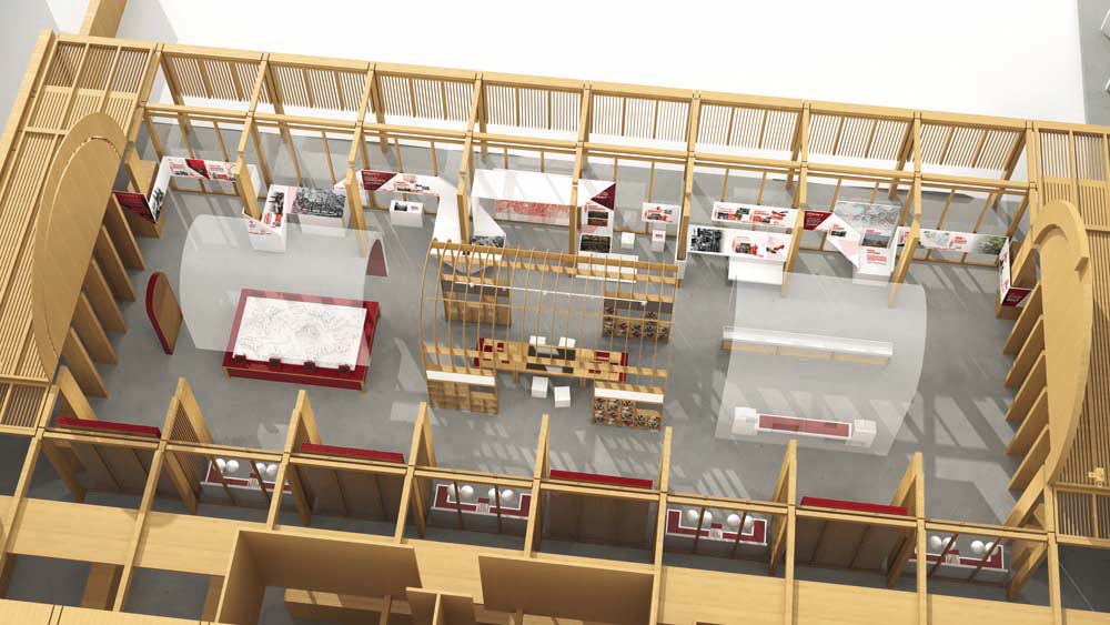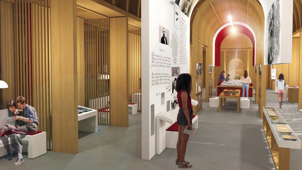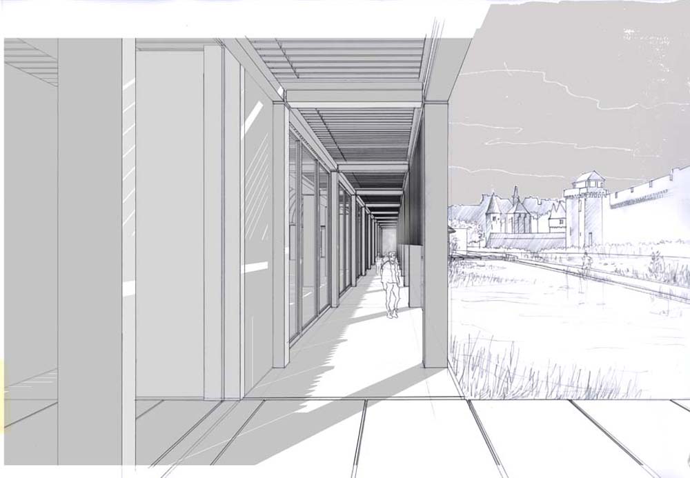 Simplicité et harmonie Les libertés prises dans l'implantation générale de l'ouvrage sont dictées par la volonté d'une clarté d'organisation et de distribution des espaces. La perception en plan de l'agencement proposé est simple. Les alignements sont respectés au nord comme au sud, dictés par les proportions et les mesures des bâtiments conservés. La trame proposée, constituée de lignes successives de poteaux, dégage trois vaisseaux parallèles différents. Le premier vaisseau au nord abrite les espaces d'entrée et de circulation, d'accueil, de billetterie et de boutique. La trame virtuelle se prolonge à l'est et opère la liaison longitudinale de tous ces espaces, comme à l'ouest, vers l'exposition temporaire. Ce dispositif est accentué par des percements intérieurs généreux des murs conservés qui permettent de lier les espaces entre eux. Le second vaisseau, au centre, constitue l'espace d'exposition permanente, vaisseau enchâssé, centre de la nef, il se démarque des autres parties par une géométrie généreuse voûtée en berceau. Le troisième vaisseau, au sud, termine la composition. Galerie couverte, ce dernier vaisseau sert d'espace intermédiaire, de filtre et d'encadrement de l'exposition centrale. Échelle de mesure – ligne de portée La perception en volume est tout autre et chaque vaisseau a sa propre géométrie : Alignement au nord, verticalité et respect de la continuité urbaine pour le premier, cœur du dispositif et générosité du vaisseau central comme enchâssé dans la composition, protection et clôture pour le vaisseau sud sur le jardin. L'érection de la trame de poteaux en élévation génère une série de portiques, une forêt de poteaux dans la profondeur du bâtiment. Cette échelle donne la dimension et la mesure de l'entre-deux, du remplissage du vide entre les parties existantes. C'est aussi une ligne de portée régulière qui devient support de l'enveloppe. C'est enfin un lien entre les parties constituant la longue façade, la ligne de portée s'étendant sur l'ensemble bâti. Cette échelle régulière, ce portique autorise le jeu, la composition de volumes en alignement, mais aussi en retrait et en encorbellement. Le remplissage de chaque vide du portique / échelle étant autonome et répondant aux fonctions en regard : transparence sur la boutique et l'accueil au niveau du visiteur, semi opacité pour certains locaux, opacité pour les autres parties. Ce jeu de surfaces de remplissage qui deviennent des volumes, permet la variété de la façade sur sa grande longueur, la composition de volumes comme autant de notes sur la ligne de portée. |