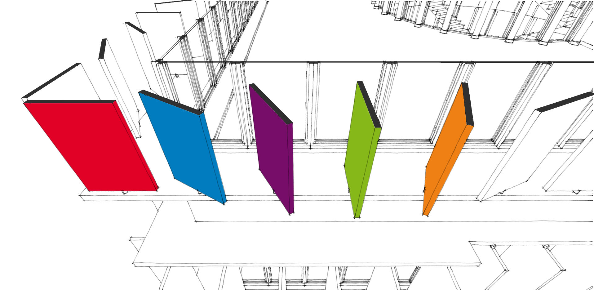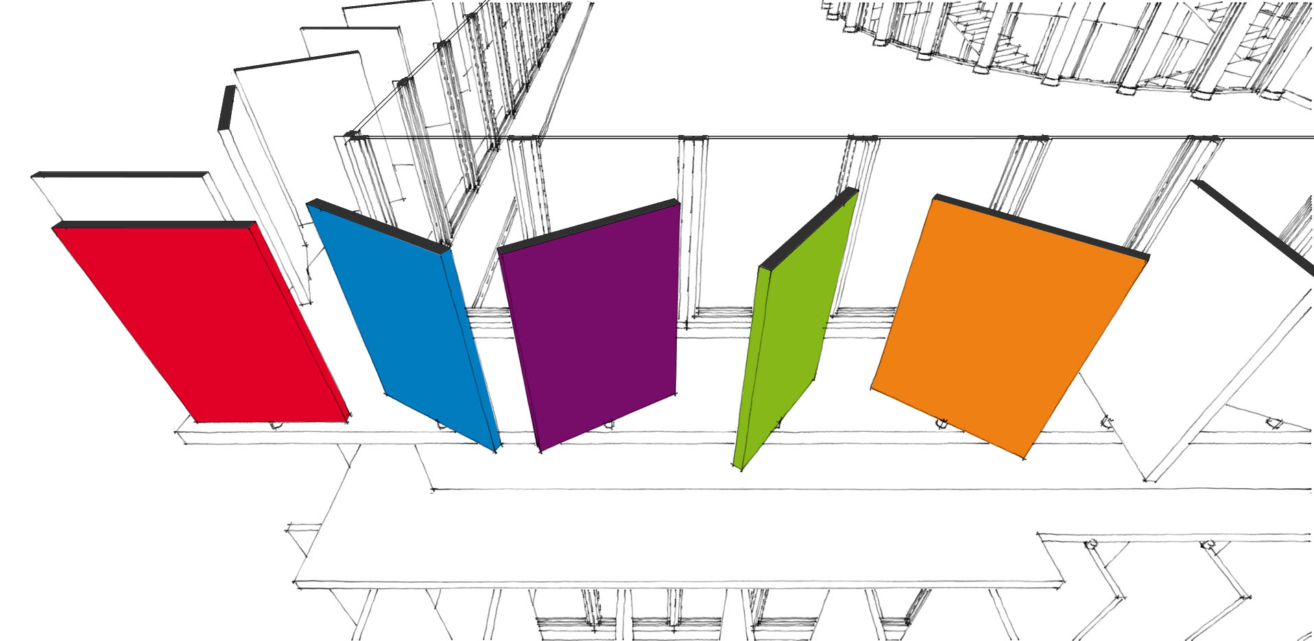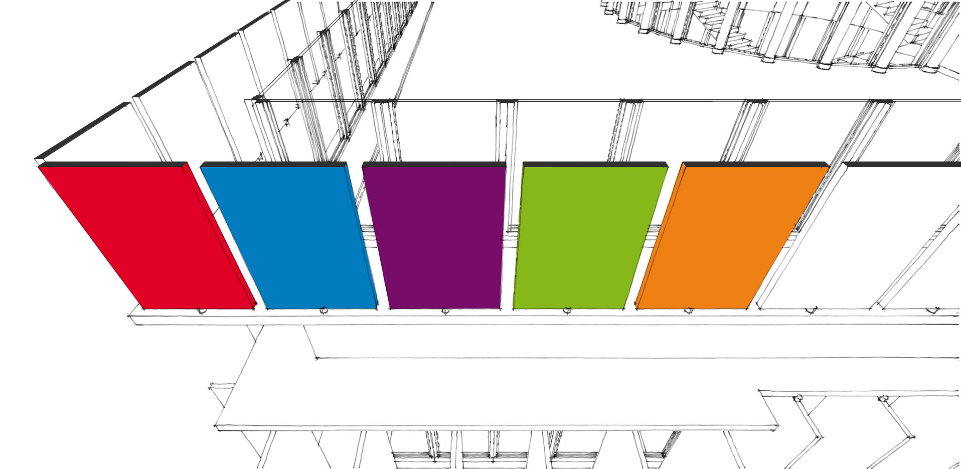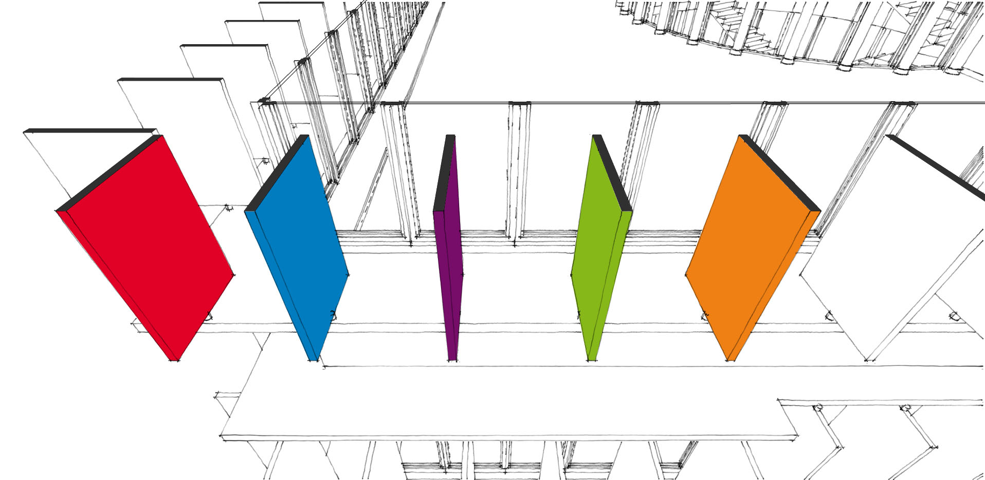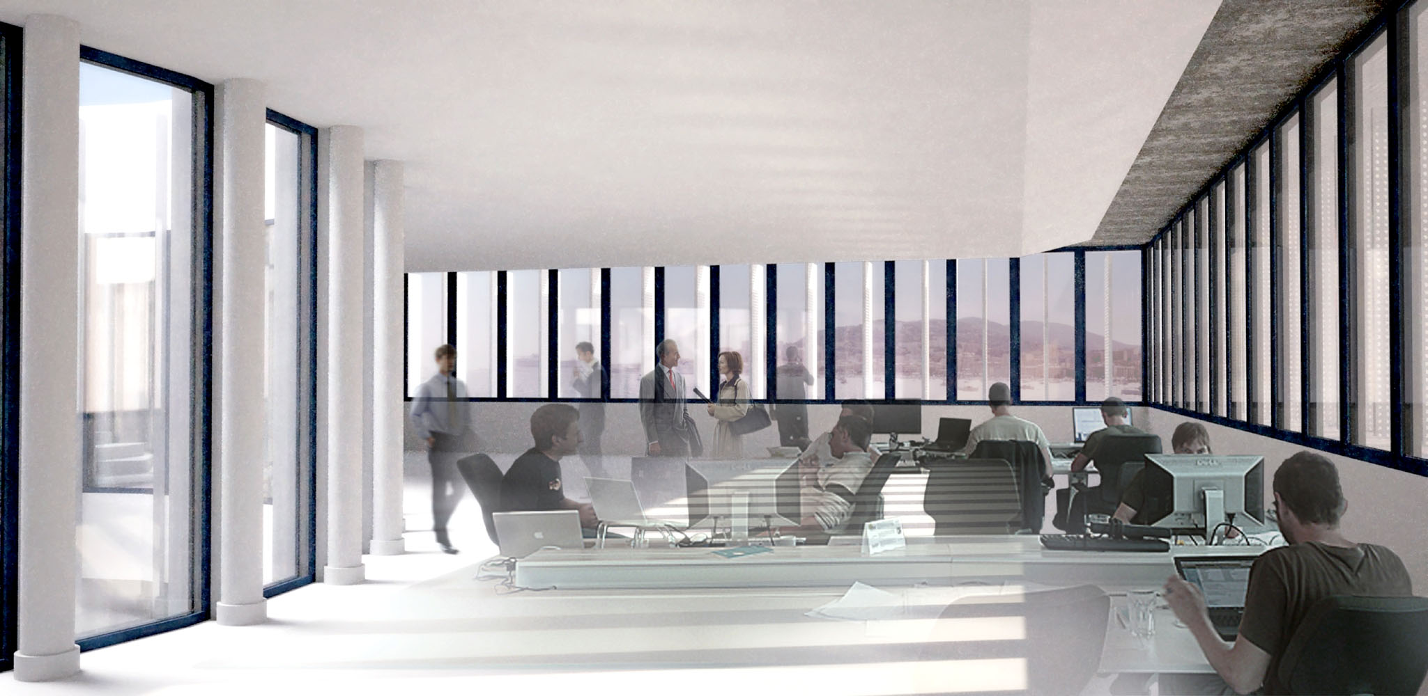 | Ici la structure de l'objet est mise en avant afin d'offrir de grands plateaux libres de tout porteur. L'usager évolue sur des nappes, entre des tubes structurels qui diffusent lumière, rafraîchissement naturel, fluides et circulations. |