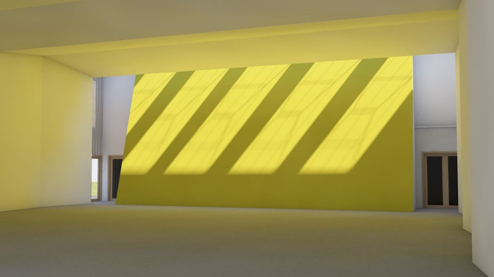 Focus sur la salle polyvalente : La lumière naturelle provient de la façade située au sud-est mais aussi à l'opposé par un éclairage zénithal disposé au fond de la salle, qui en constitue l'équilibre lumineux. Cet éclairage arrière permet également la ventilation naturelle de la salle. Les parois latérales sont aveugles et renforcent l'idée de salle axée vers son jardin. Une correction solaire et aussi acoustique est nécessaire sur la grande façade vitrée qui est positionnée en retrait à l'ombre du débord de toiture. Un brise soleil intermédiaire permettra un contrôle lumineux Traitement des parois intérieures Le traitement des parois est conçu comme un plissement régulier rythmé par la structure de l'ouvrage. Un traitement plus fin et plus résistant sera réalisé sur une hauteur de 2 m. environ. Les parois hautes possèdent des qualités acoustiques par la disposition des plis successifs de l'habillage, mais aussi par le traitement de certaines zones en matériaux absorbants (perforation et absorption). |