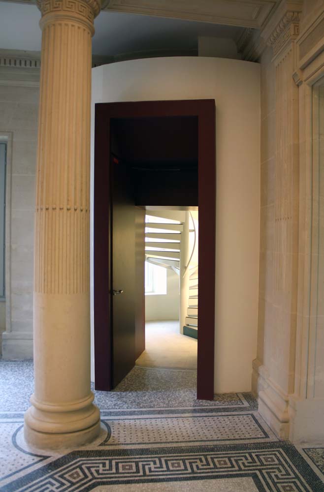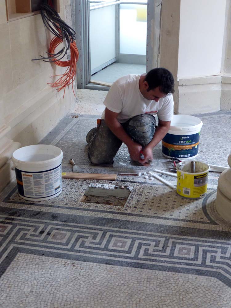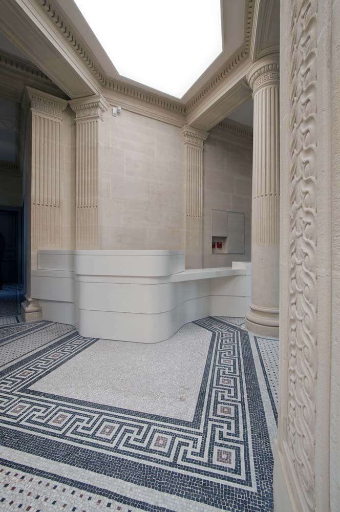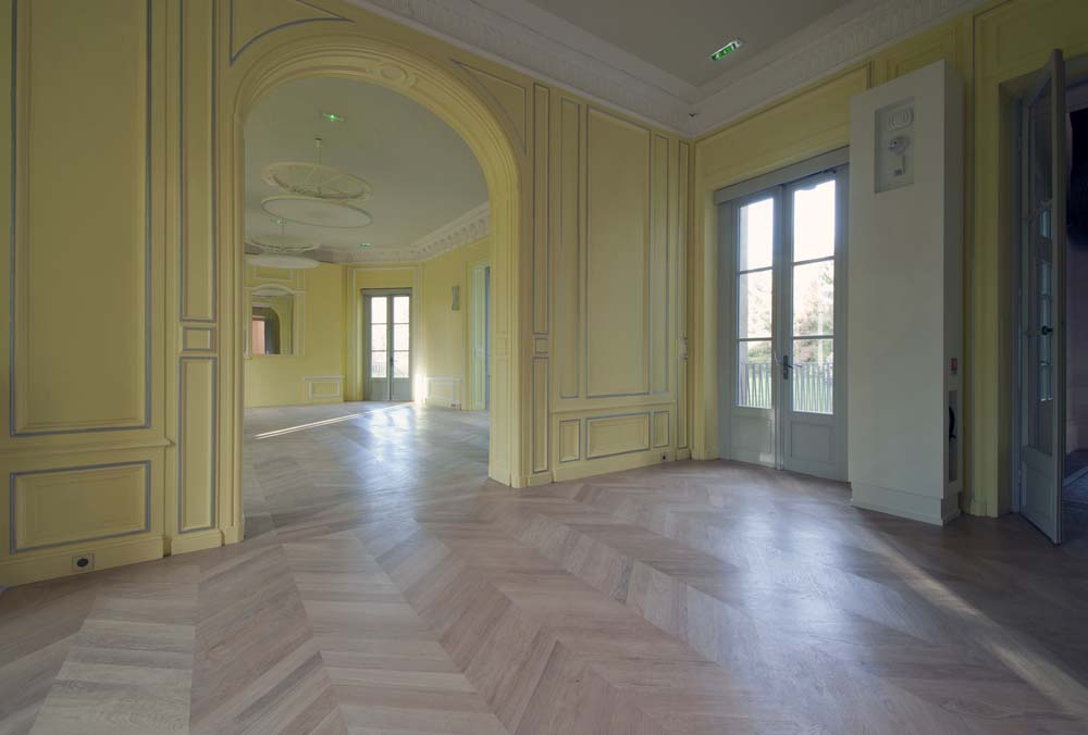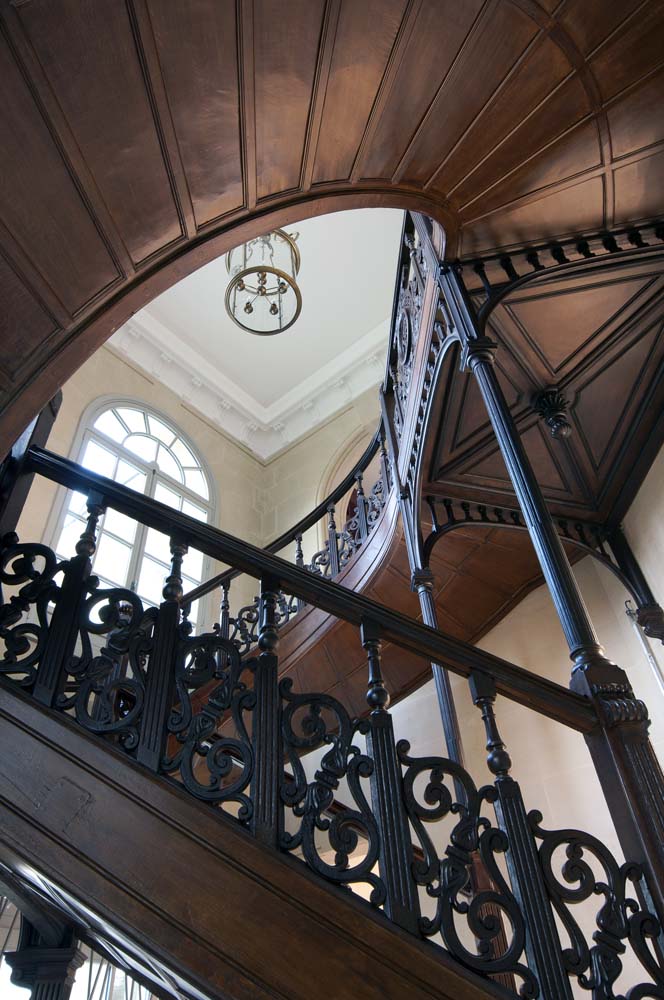 L'aile nord semble la plus ancienne et date vraisemblablement de 1838. Sans documents historiques précis, il est difficile de déterminer la part de l'édifice attribuée à l'architecte Paul-Ernest Sanson et vraisemblablement construite entre 1872 et 1878. Si l'escalier central fait peu de doute sur cette paternité, témoin du goût de cet architecte pour les escaliers d'apparat, il est plus difficile, sans une analyse plus poussée du bâti et des documents historiques de délimiter clairement son intervention. Il est toutefois évident que l'aile sud, possédant des planchers formés de voûtains en brique et profils métalliques AO, sont très différents des planchers bois de l'aile nord. Il est donc très probable que tout ou partie de l'aile sud provient de la même campagne de construction que la cage d'escalier centrale. On peut donc maintenir l'idée que Paul-Ernest Sanson a réinterprété l'ensemble des façades et contribué à donner à l'édifice son homogénéité actuelle. L'aile sud étant d'une facture plus travaillée : ses pinacles et ses cheminées conférant à l'édifice cet esprit néo-renaissance. Les vestiges conservés des intérieurs à rez-de-cour sont de facture assez inégale. Là encore, on peut distinguer trois parties : L'aile nord est constituée de décors assez élémentaires de faux lambris assez mal proportionnés. Les éléments menuisés, les portes et leurs ébrasements seront restaurés. Les faux lambris d'appui seront retraités. Le corps central avec ses mosaïques au sol et ses décors de pierre à l'ordonnancement néo-classique, ainsi que l'escalier d'apparat seront mis en valeur. La partie sud plus raffinée, aux lambris d'appui et montants lambrissés seront également restaurés. |