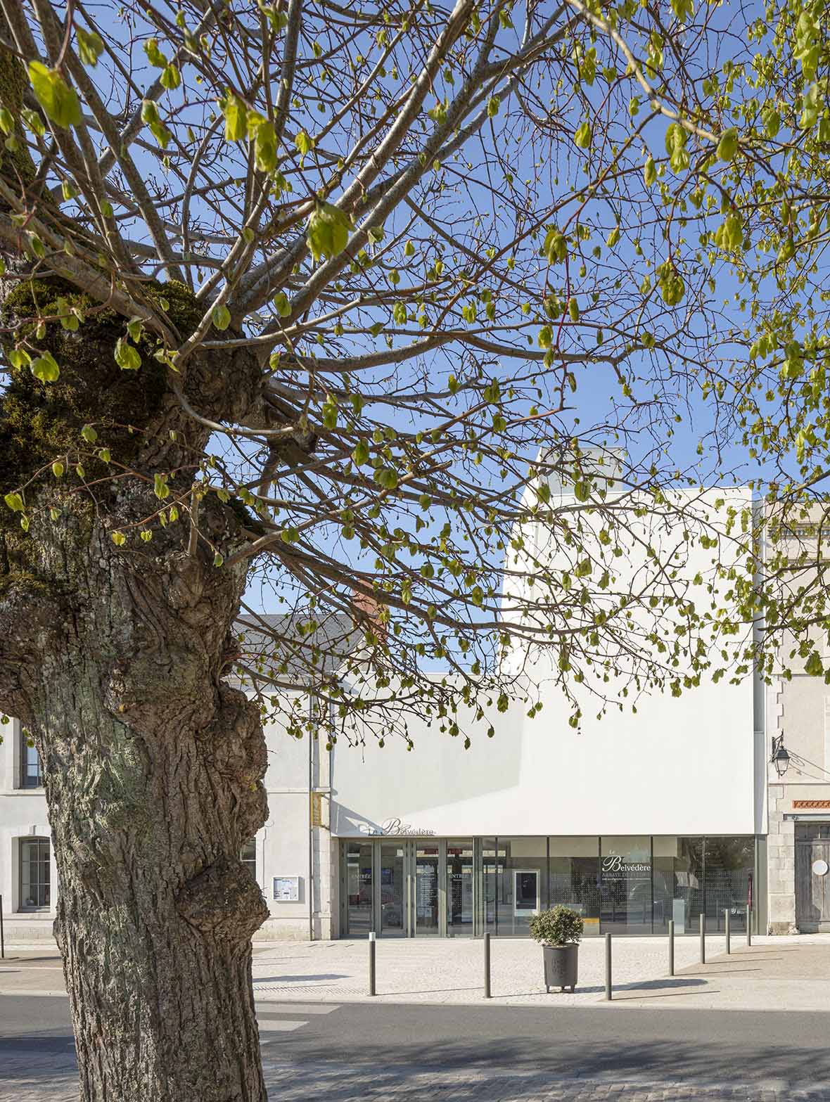 Le passage-porche Le jeu de transparences et de profondeurs prend tout son sens au niveau du porche. Les différents plans se succèdent du passage à la galerie et ses poteaux, puis au mail d'arbres de l'avenue Chateignier. Le passage/ porche est un espace vide. Il est le lieu d'articulation entre les transparences en profondeur et les transparences latérales entre accueil et boutique. |