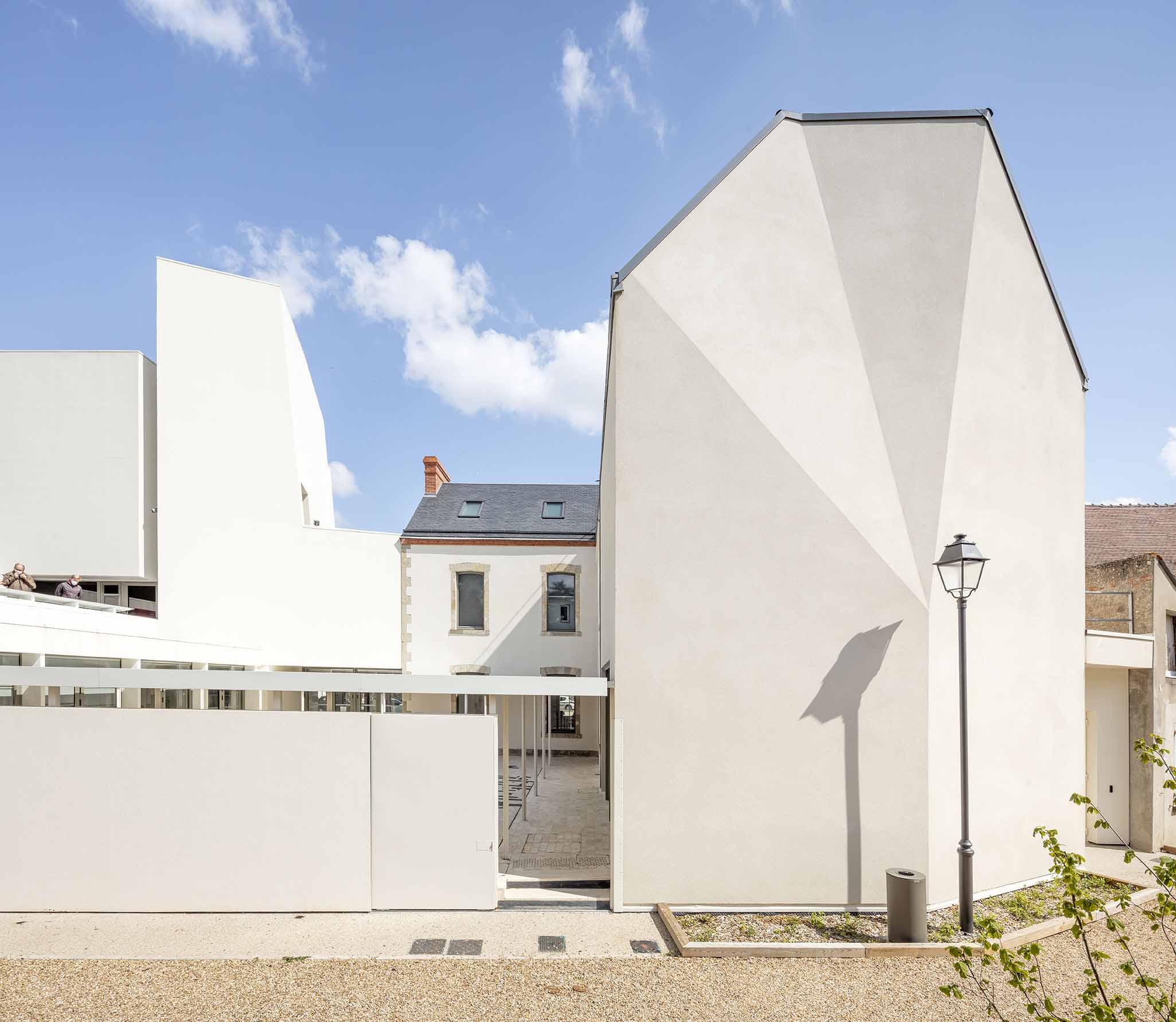 Un pont, une tour Élément monolithique immédiatement perceptible, cet objet sans aspérités traduit sans détour, une force mais aussi une impression de légèreté. Le contraste est maximum entre une surface blanche, unie, peu contrastée et une ouverture toute largeur faite de miroitements, de reflets, d'objets vus à travers les vitrages de l'accueil et la transparence du porche. En bas, la partie ouverte, contraste avec celle du haut, partie fermée des espaces scénographiques, la matité avec la transparence. Métaphore contemporaine de la tour-porche, cette forme est aussi une tour-pont, à la structure absente. C'est une composition d'écrans qui permet de contrôler les vues, de filtrer la lumière ; où les percements résultent des vides entre les écrans. Leurs positions permettent de cadrer les vues vers la place, la cour ou l'abbatiale tout en limitant les effets de lumière à l'intérieur du volume. à rez-de-chaussée, celle d'un pont suspendu entre deux rives, est au contraire montrée à l'étage. L'envers de la forme, l'envers des écrans extérieurs est un assemblage d'une structure portée d'un bâtiment à l'autre ; support des façades écrans, support des éléments scénographiques. |